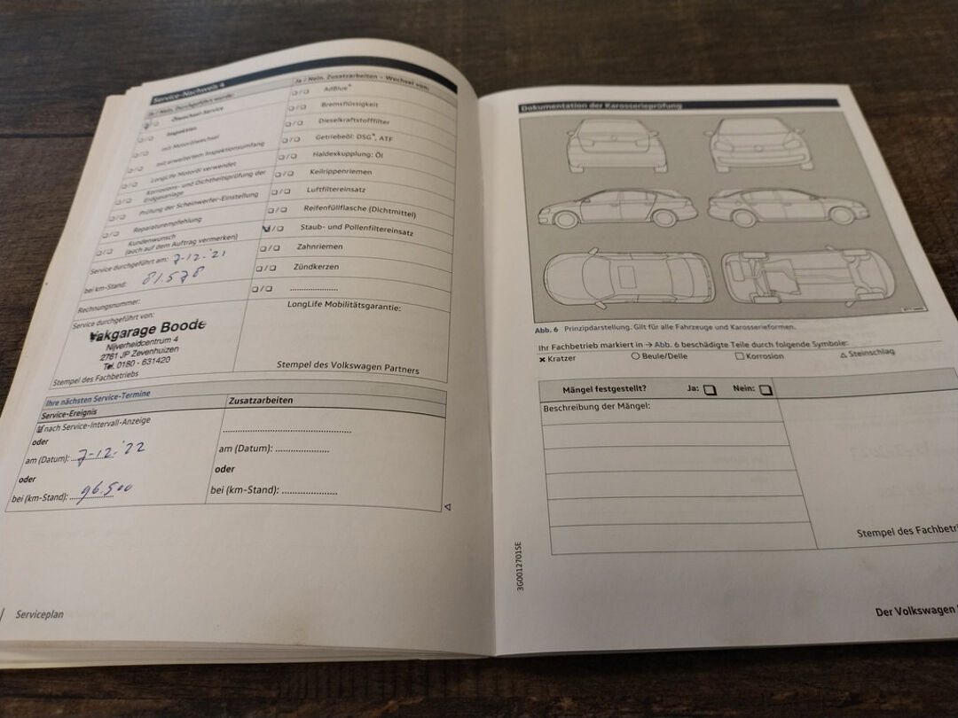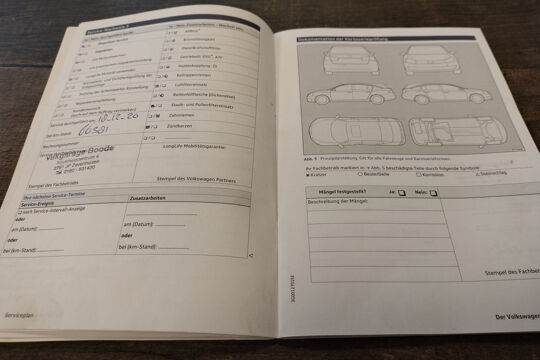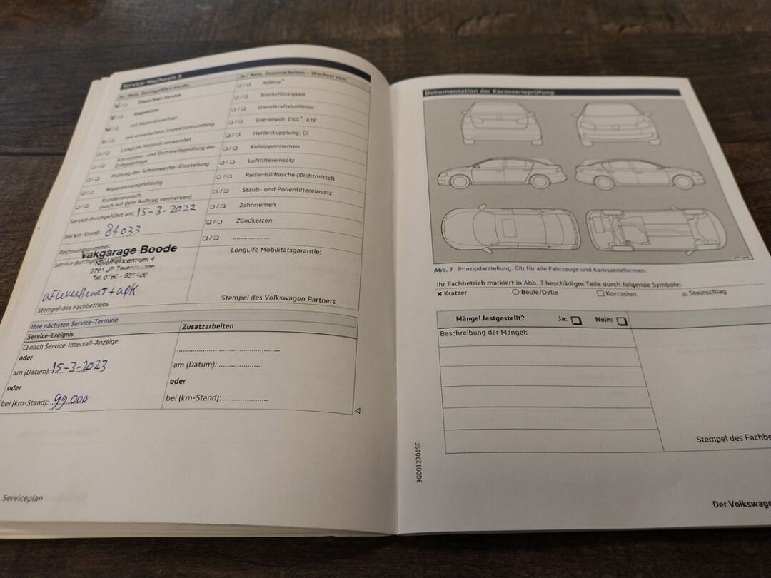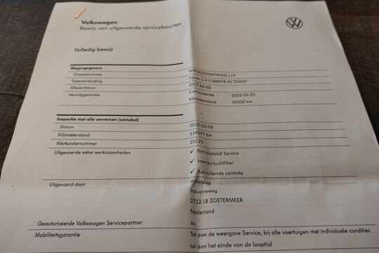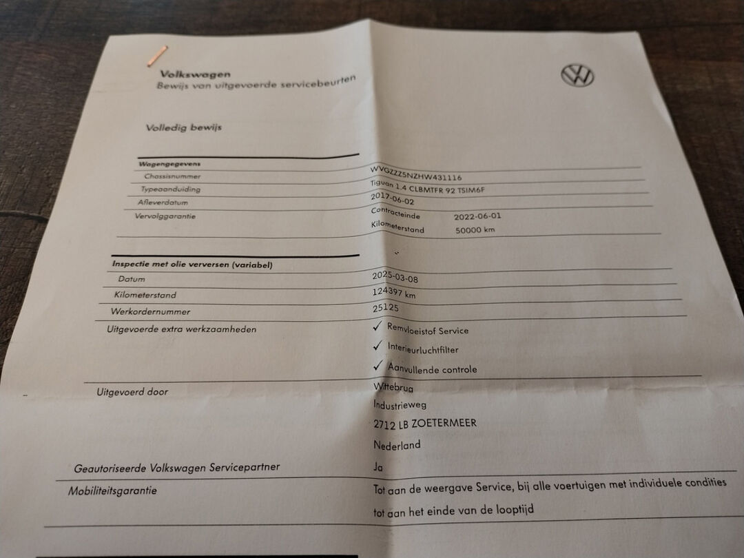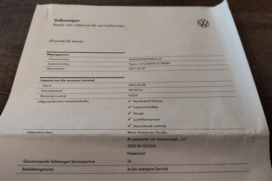 Deze Tiguan is bij de VW-dealer onderhouden bij 124.397 km op 8-3-2025 (o.a. motorolie, oliefilter, interieurfilter en remvloeistof vernieuwd) en bij 98.749 km op 8-2-2023 (o.a. motorolie, oliefilter, interieurfilter, luchtfilter, bougies en remvloeistof vernieuwd). Bij 84.033 km (in maart 2022), bij 81.578 km (in december 2021), en bij 66.381 km (in december 2020) is er door onze werkplaats onderhoud uitgevoerd. En de eerste twee onderhoudsbeurten (bij 61.050 km in april 2020 en bij 29.636 km in november 2018) zijn in Duitsland door de VW-dealer uitgevoerd. Het onderhoudsboekje is aanwezig, en aanvullend ook de uitdraai uit het digitale onderhoudsregister van VW.