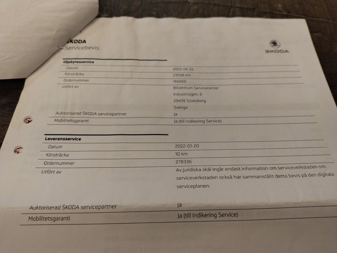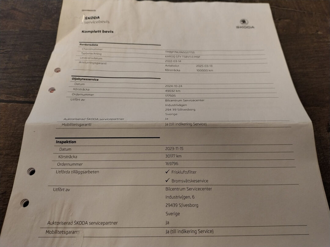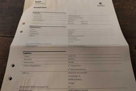 Deze Skoda is bij de Skoda dealer onderhouden bij 23.598 km op 22-6-2023 (o.a. motorolie en oliefilter vernieuwd), bij 30.177 km op 15-11-2023 (o.a. interieurfilter en remvloeistof vernieuwd), en bij 49.032 km op 24-10-2024 (o.a. motorolie en oliefilter vernieuwd).