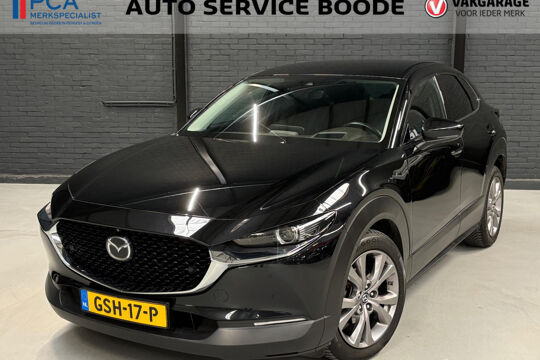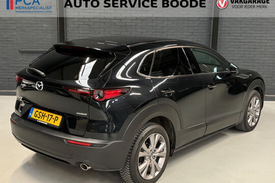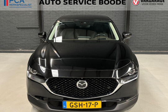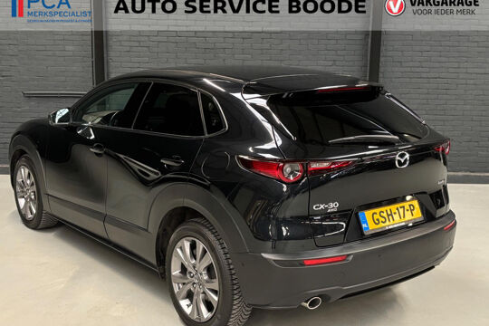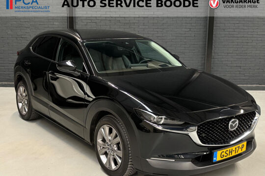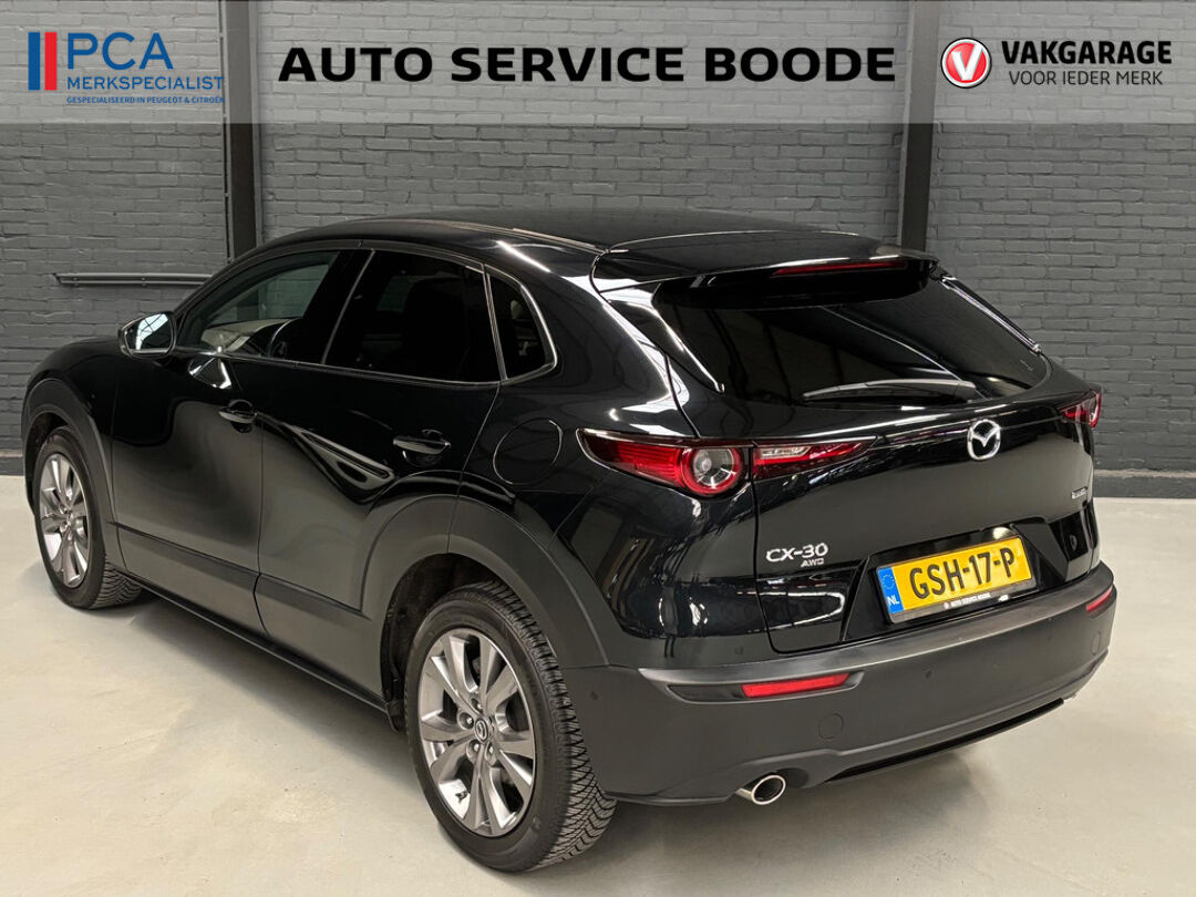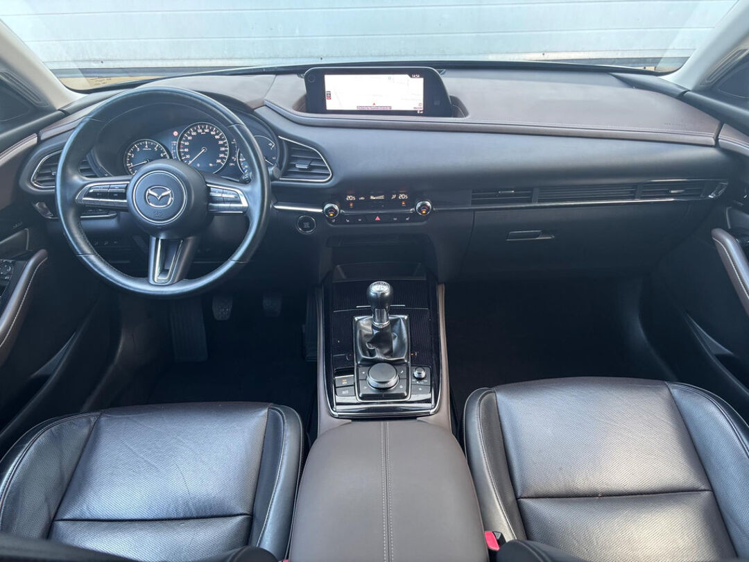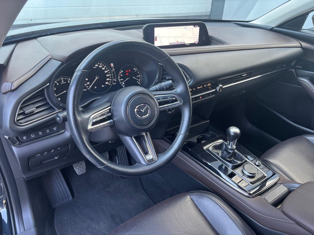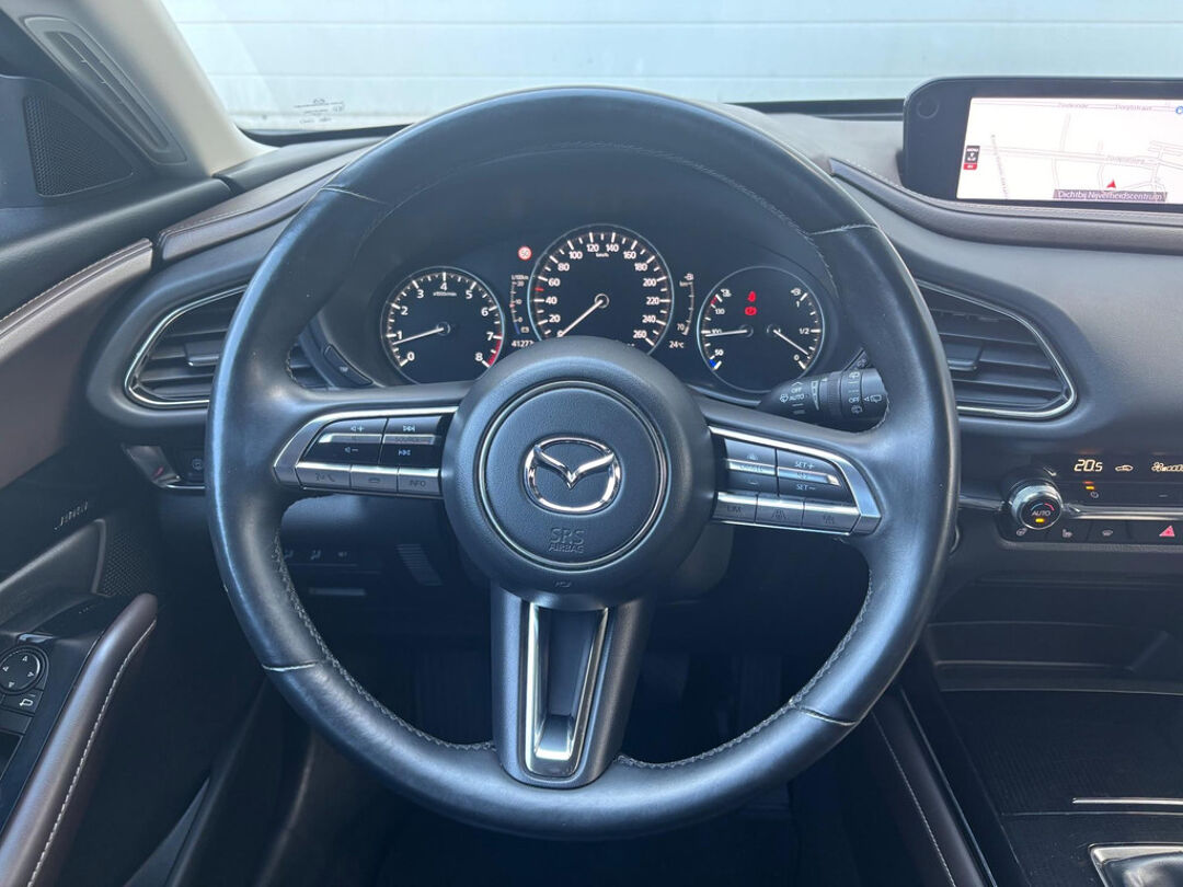 Mooie Mazda CX-30 in de luxe Luxury uitvoering met o.a. rondomzicht camera, lederen bekleding, elektrisch verstelbare bestuurdersstoel met geheugenfunctie, en Bose-audiosysteem! Deze CX-30 is voorzien van de 122 pk-sterke Skyactive-G motor in combinatie met 4-wielaandrijving (AWD), Mild Hybrid techniek, en een handgeschakelde 6-versnellingsbak.