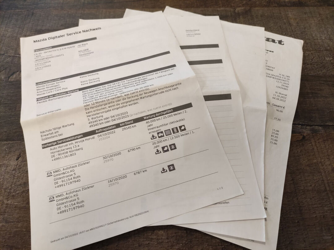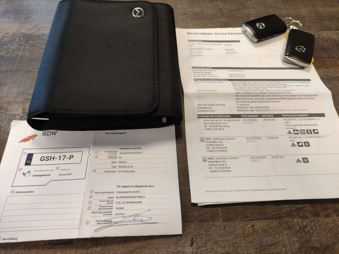 De onderhoudshistorie van deze Mazda is aanwezig, en de kilometerstand is onder andere aantoonbaar door middel van een uitdraai uit het digitale serviceregister van Mazda. Deze CX-30 heeft onderhoud gehad bij 6.790 km in oktober 2020 (o.a. motorolie en oliefilter vernieuwd), en bij 29.340 km in oktober 2022 (o.a. motorolie, oliefilter, interieurfilter, luchtfilter en remvloeistof vernieuwd).