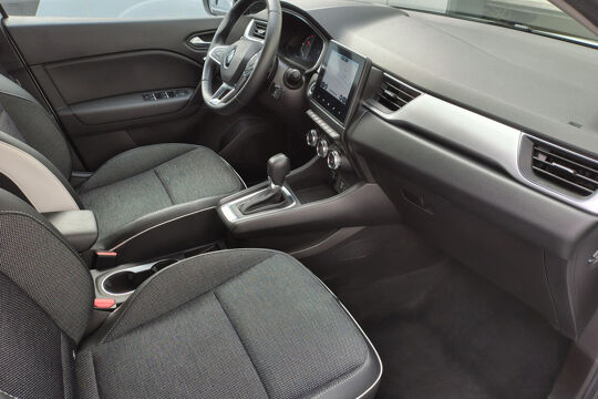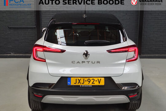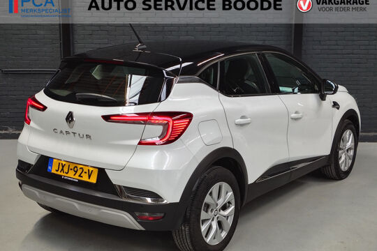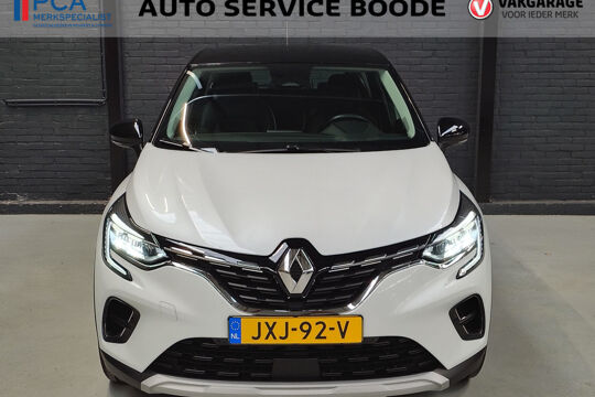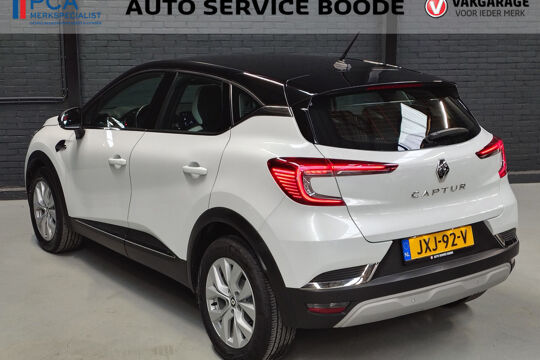 Mooie Renault Captur met Mild Hybride aandrijflijn met 140 pk, gekoppeld aan een soepele 7-traps automaat. In de Intens uitvoering is deze Captur voorzien van onder andere een touchscreen navigatiesysteem (met aanvullend ook ondersteuning van Apple Carplay en Android Auto), Bluetooth-carkit, achteruitrijcamera i.c.m. parkeersensoren voor + achter, cruise control, climate control, half (kunst)lederen bekleding, IsoFix, keyless entry + start, LED verlichting, 17 inch lichtmetalen velgen, en two-tone carrosserieafwerking (wit metallic i.c.m. een zwart dak).