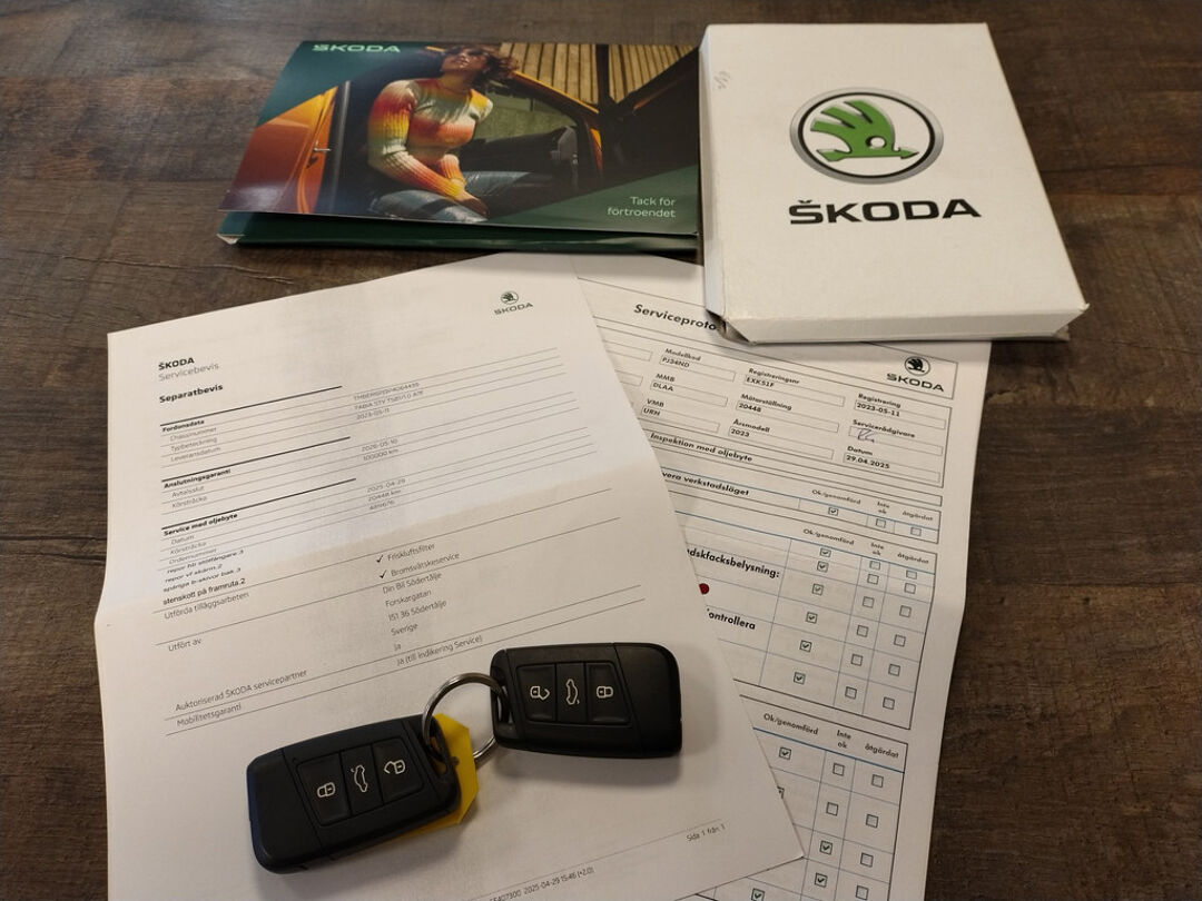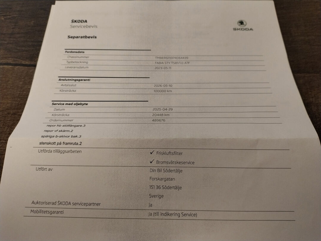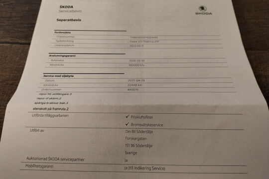Deze Fabia heeft bij 20.448 km op 29-4-2025 onderhoud gehad bij Skoda-dealer Din Bil Sodertalje in Zweden. Toen zijn onder andere motorolie, oliefilter, interieurfilter en remvloeistof vernieuwd. Dit onderhoud staat digitaal geregistreerd in het serviceregister van Skoda, en een uitdraai is aanwezig.