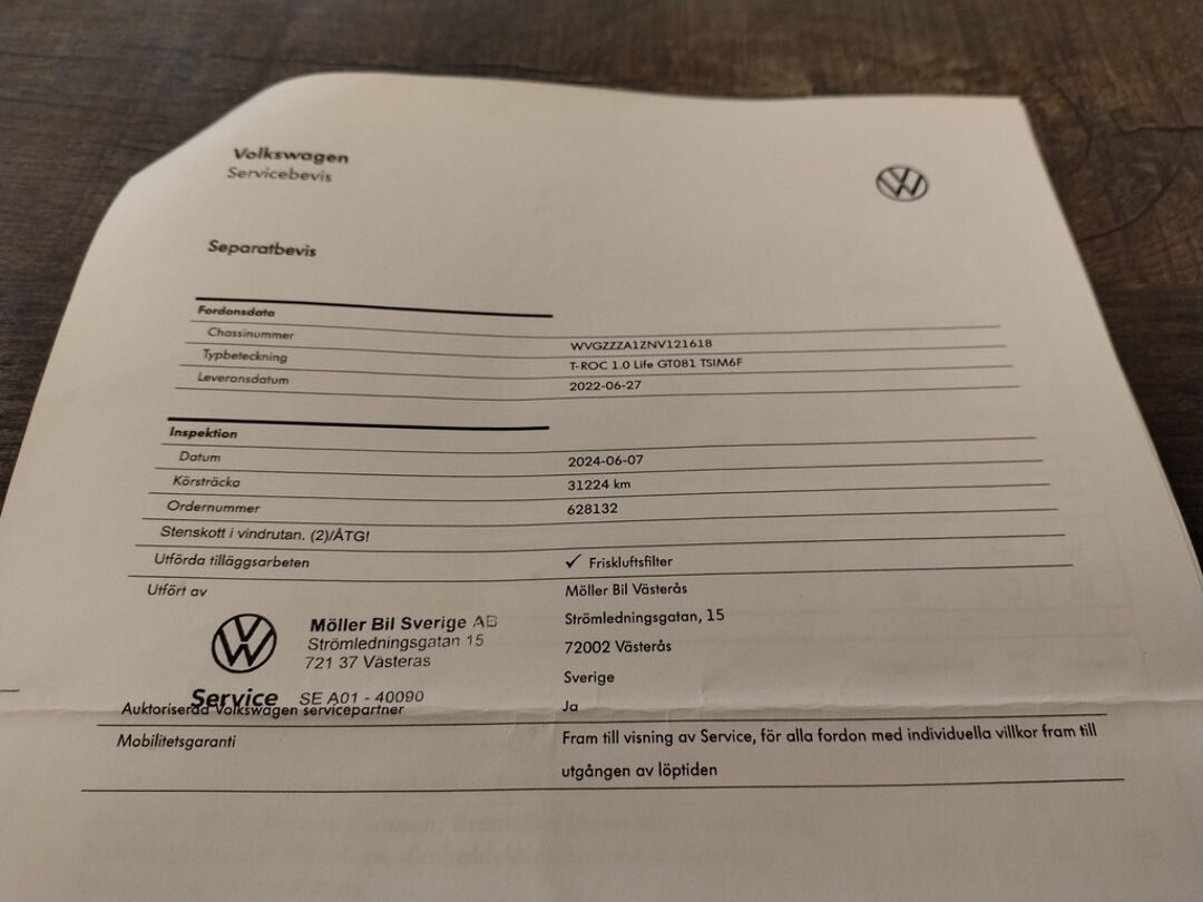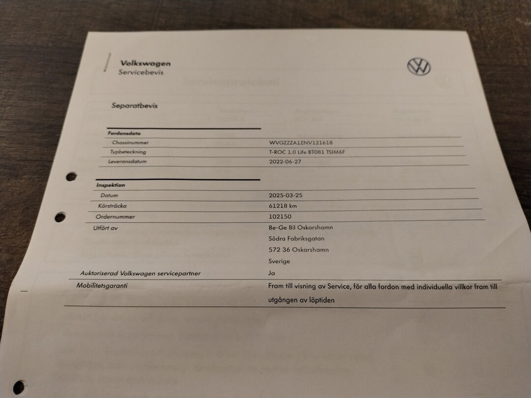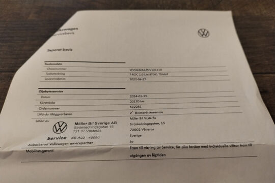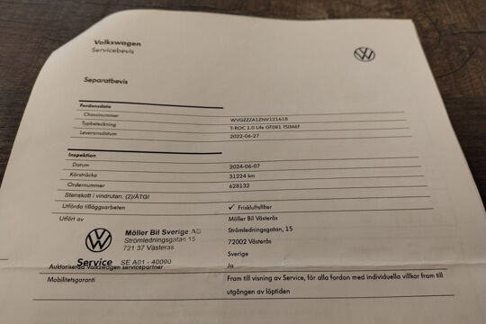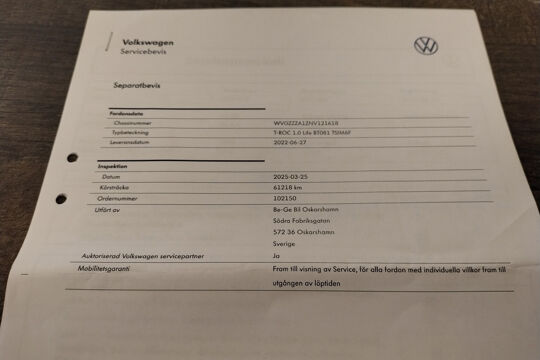 Deze T-Roc is afkomstig van de eerste eigenaar. De onderhoudshistorie staat netjes digitaal geregistreerd in het serviceregister van VW. Deze T-Roc is door de VW-dealer in Zweden onderhouden bij 61.218 km op 25-6-2025, bij 50.209 km op 13-12-2024, bij 31.224 km op 7-6-2024, en bij 20.170 km op 15-1-2024.