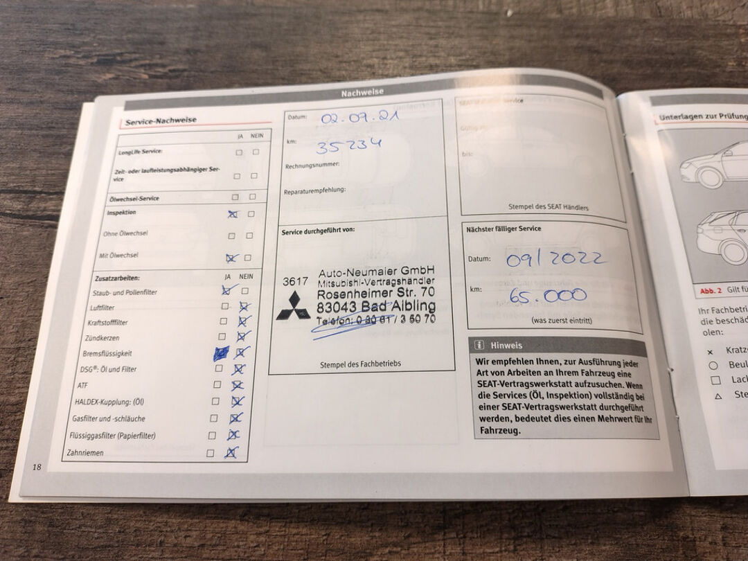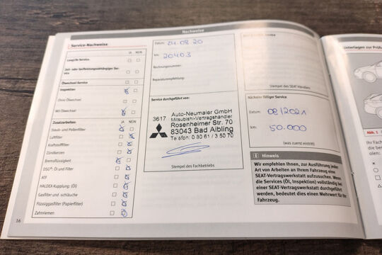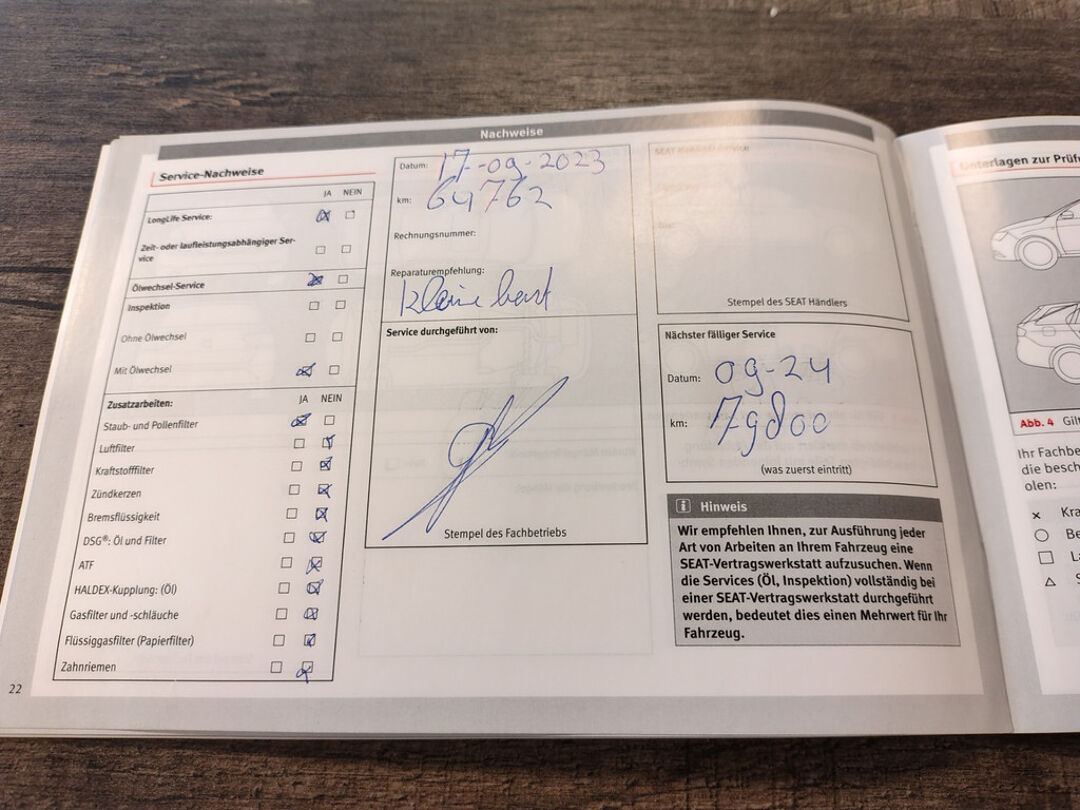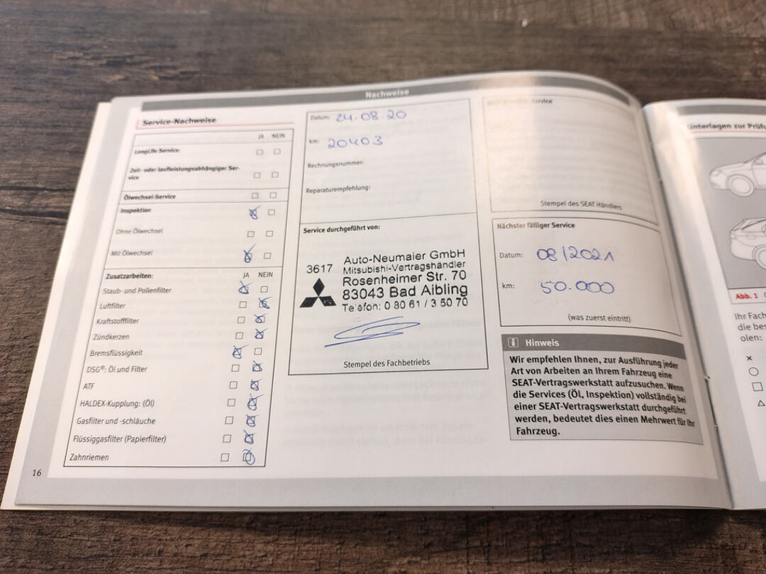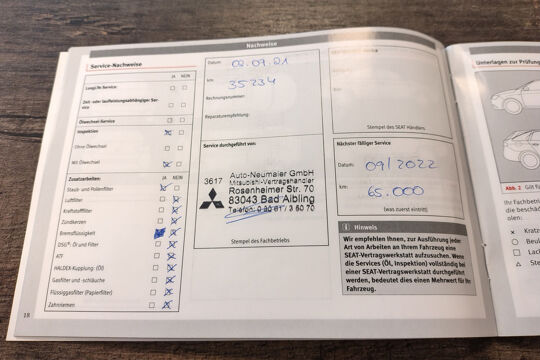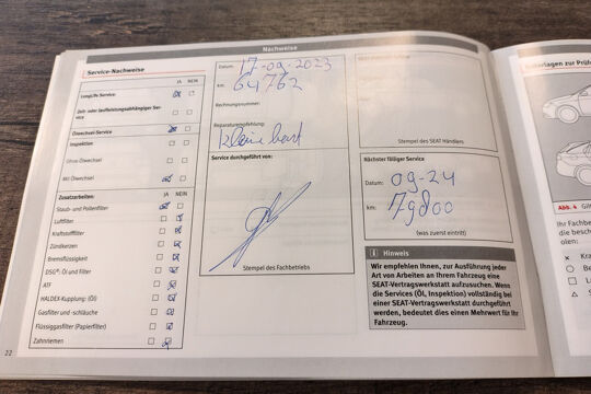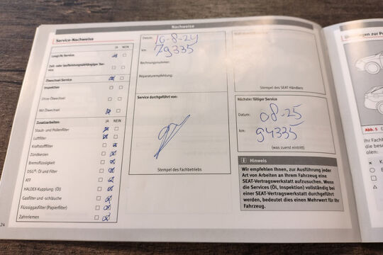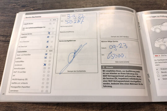 De onderhoudsboekjes zijn aanwezig en ingevuld. Er is onderhoud uitgevoerd bij 20.403 km (in augustus 2020), bij 35.234 km (in september 2021), bij 50.287 km (in september 2022), bij 64.762 km (in september 2023), bij 79.335 km (in augustus 2024), en bij 93.284 km (in juli 2025). Bij 93.284 km zijn onder andere motorolie, oliefilter, interieurfilter, luchtfilter, bougies, remvloeistof, en remblokken aan achterzijde vernieuwd, en is het aircosysteem gevuld.